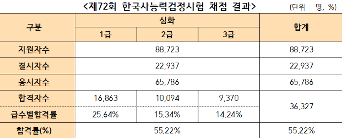 최근 시행된 제72회 한능검의 결과는 매우 흥미로운데요. 응시자는 총 1000명이며, 평균 합격률은 55%로 나타났습니다. 자세한 결과는