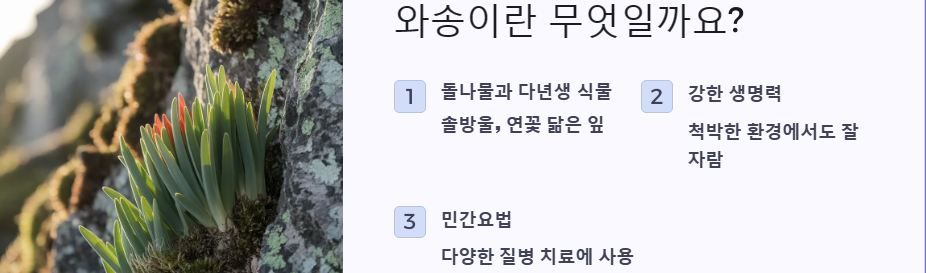 "여러분, 혹시 와송이라는 식물을 아시나요? 독특한 생김새 때문에 '지붕 위의 솔'이라고도 불리는 와송은 예로부터 약재로 사용되어 온 신비로운 식물입니다. 최근에는 와송의 다양한 효능이 밝혀지면서 더욱 주목받고 있는데요. 오늘은 와송의 효능과 활용법, 보관법, 그리고 주의해야 할 부작용까지 자세히 알아보는 시간을 가져보도록 하겠습니다."