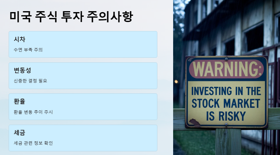 미국 주식 투자는 글로벌 시장에 참여할 수 있는 좋은 기회이지만, 거래 시간을 비롯하여 주의해야 할 점들이 많습니다. 이 글에서 제공된 정보를 바탕으로 신중하게 투자 결정을 내리시고, 성공적인 미국 주식 투자를 하시길 바랍니다.