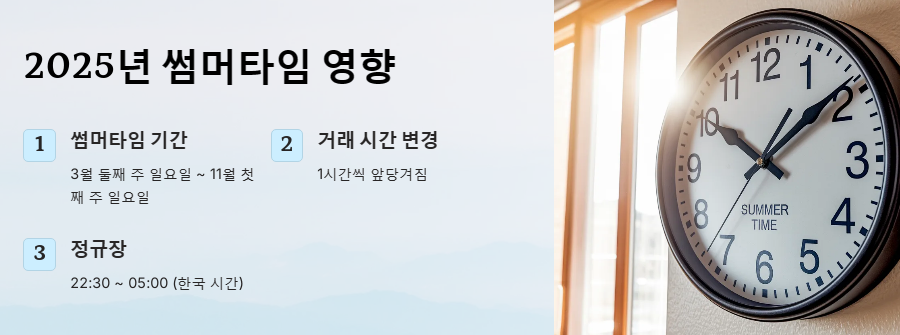 - 썸머타임 적용 시 정규장 (2025년): 22:30 ~ 05:00 (한국 시간)