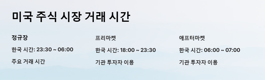 미국 주식 시장은 크게 정규장, 프리마켓, 애프터마켓으로 나뉘며, 각 시장별 거래 시간이 다릅니다.