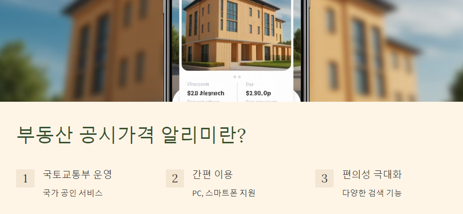 국토교통부에서 운영하는 부동산 공시가격 알리미는 국민들이 쉽고 편리하게 부동산 공시가격을 확인하고 관련 정보를 얻을 수 있도록 제공하는 국가 공인 서비스입니다. PC는 물론이고 스마트폰만 있다면 언제 어디서든 간편하게 이용할 수 있으며, 다양한 검색 기능과 맞춤형 정보 제공을 통해 사용자 편의성을 극대화했습니다.
