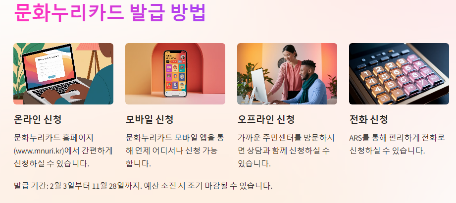 문화누리카드는 온라인, 모바일, 오프라인, 전화 등 다양한 방법으로 발급받을 수 있습니다.