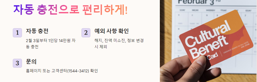 위의 경우에는 자동 충전 대상에서 제외될 수 있으니, 문화누리카드 홈페이지 또는 고객센터(1544-3412)를 통해 확인해 보세요. 📞