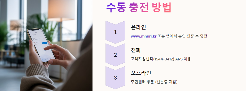 • 온라인 충전: 문화누리카드 홈페이지(www.mnuri.kr) 또는 모바일 앱에서 본인 인증 후 충전 💻📱