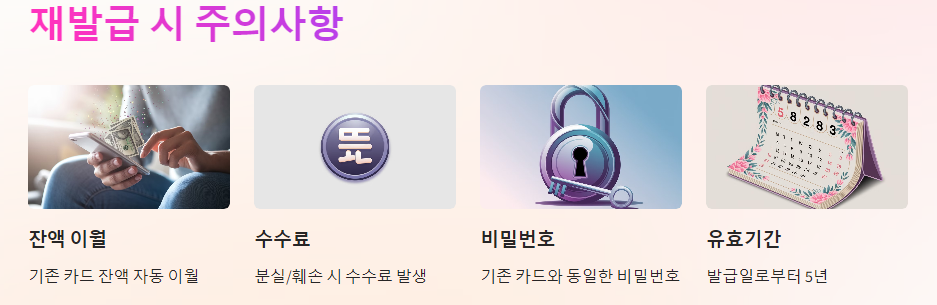 • 기존 카드 잔액: 재발급 시 기존 카드에 남아있던 잔액은 새로운 카드로 자동 이월됩니다. 💰