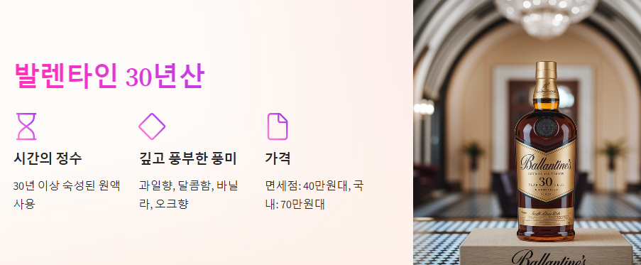 • 특별한 선물: 소중한 사람에게 잊지 못할 감동을 선사하고 싶을 때, 발렌타인 30년산은 최고의 선택입니다.