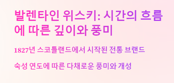 발렌타인. 1827년 스코틀랜드에서 시작된 이 브랜드는 긴 시간 동안 전 세계 위스키 애호가들의 사랑을 받아왔습니다. 긴 역사와 전통, 그리고 숙련된 마스터 블렌더의 기술이 만들어낸 발렌타인 위스키는 그 자체로 하나의 예술 작품이라 할 수 있죠. 🎨 특히 발렌타인은 숙성 연도에 따라 다채로운 풍미와 개성을 선보이며, 각기 다른 매력으로 위스키 애호가들을 매료시킵니다.