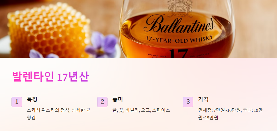 • 합리적인 가격으로 프리미엄 위스키를 경험하고 싶다면 발렌타인 17년산을,