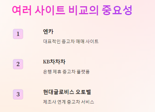 최대한 많은 중고차 시세 조회 사이트를 이용하여 차량가액을 비교해 보세요. 다양한 정보를 종합하여 객관적인 시세를 파악하는 것이 중요합니다.