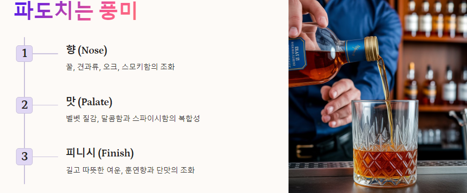 • 피니시 (Finish): 길고 따뜻한 여운이 오랫동안 지속됩니다. 훈연향과 은은한 단맛이 조화롭게 마무리되며, 깊은 만족감을 선사합니다.