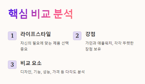 | 단점 | 제한적인 스마트 기능, 투박한 디자인 (호불호) | 짧은 배터리 수명, 높은 가격, 안드로이드 호환 X |