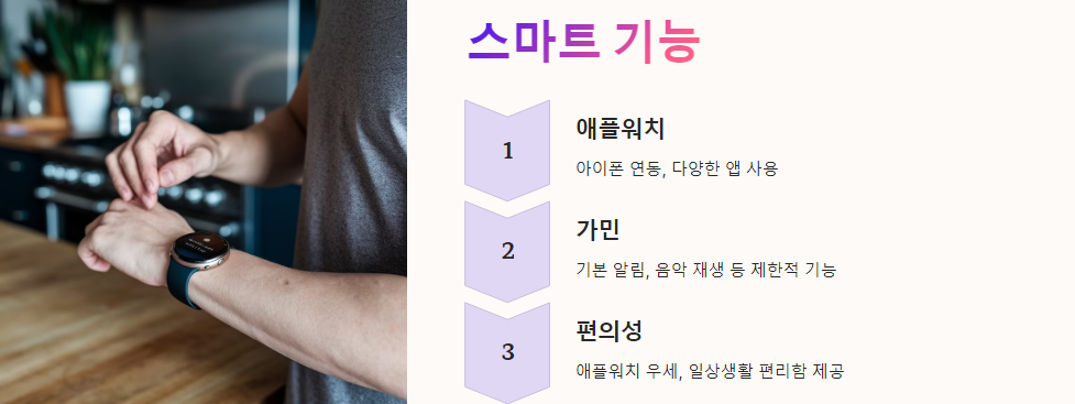 | 스마트 기능 | 알림, 간단한 음악 재생 등 기본 기능, 제한적인 앱 생태계 | 전화/문자, 알림, 음악, 앱, 애플페이 등 다양한 기능, 아이폰 연동 최적화 |