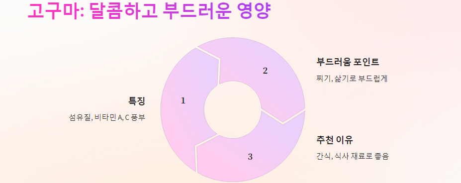 - 추천 이유: 자연스러운 단맛, 부드러운 조직감, 풍부한 섬유질 고구마는 간식으로 즐기거나 식사 재료로 활용 모두 좋습니다. 섬유질은 배변 활동을 촉진하고 비타민 A는 눈 건강에 도움을 줍니다. 겨울철 간식으로 따뜻한 고구마는 몸과 마음을 편안하게 만들어줍니다. 🍠