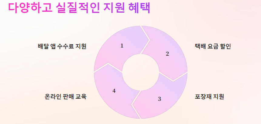 • 지원 내용: 배달 앱 주문 수수료 일부 지원, 택배 이용 요금 할인 쿠폰 제공, 포장 재료 구매 비용 지원 등 (세부 지원 내용은 사업별 상이)
