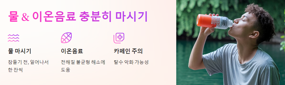 1. 💧 물 & 이온음료 충분히 마시기 : 탈수 증상 해결 & 전해질 보충!