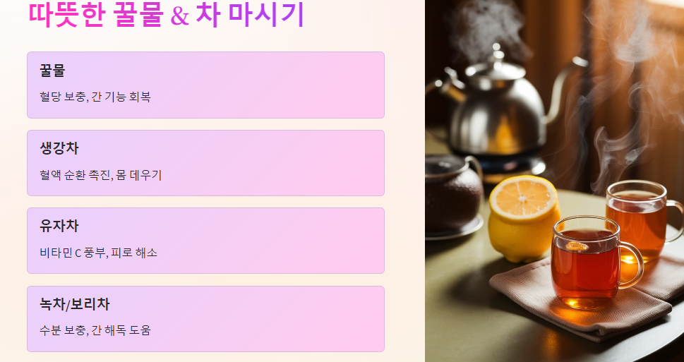 2. 🍲 따뜻한 꿀물 & 차 마시기 : 혈당 보충 & 간 기능 회복!